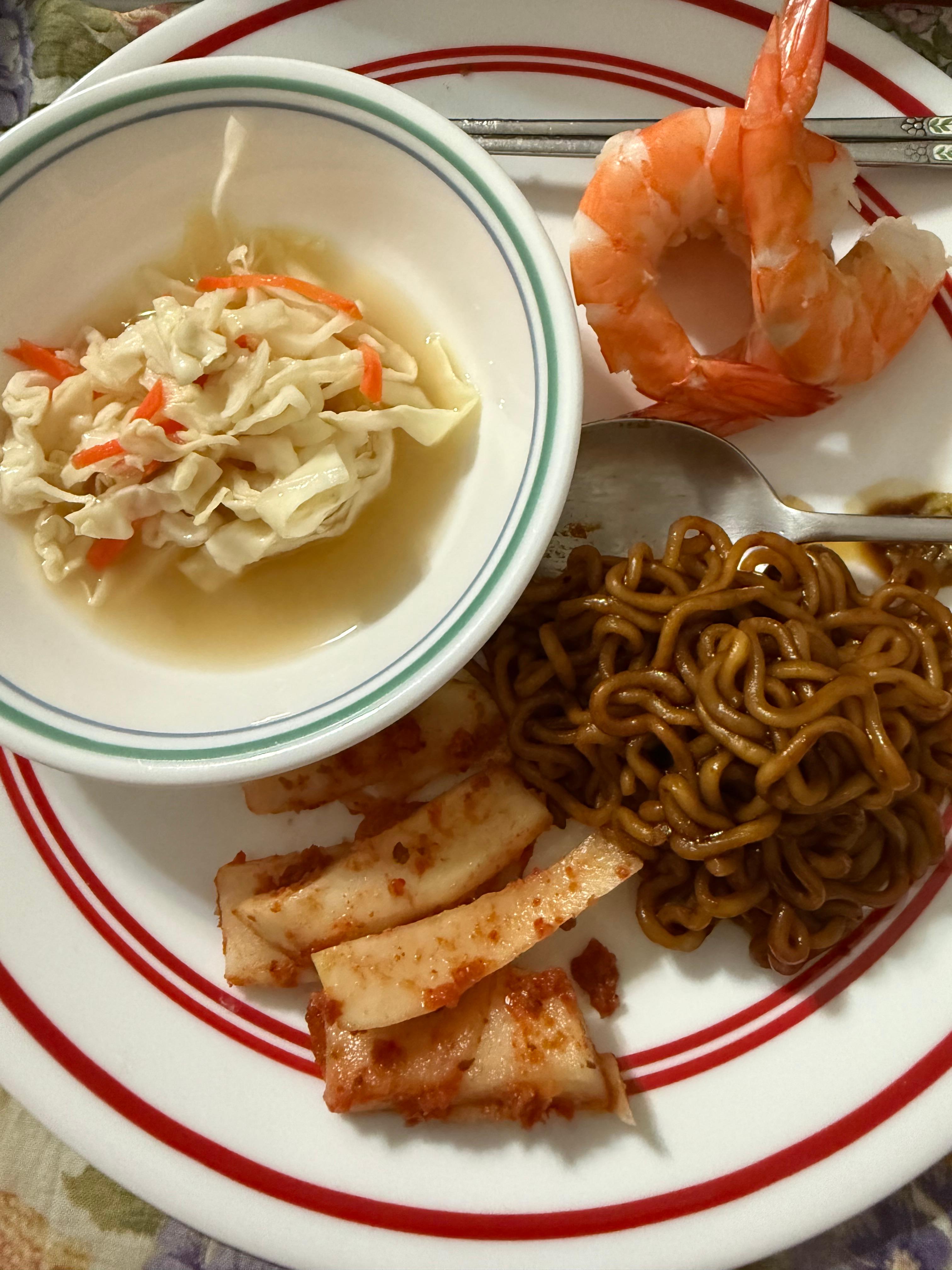 새우가 먹고 싶어서 토요일 저녁 손질해서 냉장실에 넣어 놓고는 어제 일요일에 까맣게 잊고 있다가 저녁에야 새우를 발견을 했다. 그래서 월요일 아침에 살짝 데쳐서 엄마는 아침에 먹고 남겨 놨다가 저녁 식사에 아들을 주었다. 아들이 짜파게티가 먹고 싶다며 끓여서 엄마를 조금 나눠 주었고 새우도 혼자 먹기 미안했는지 조금 나눠 주었다.