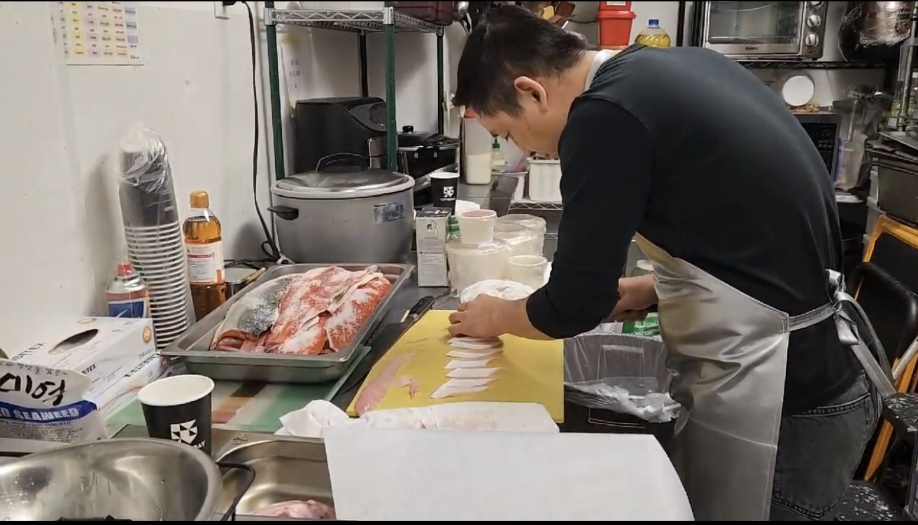알라스카산 연어는 자연산이라 빛깔이 더 진하고 맛도 쫄깃해서 시중에서 파는 양식 연어보다 가격도 더 높고 맛도 훨씬 더 좋다고 요리사 형제님께서 평을 해 주었다고~